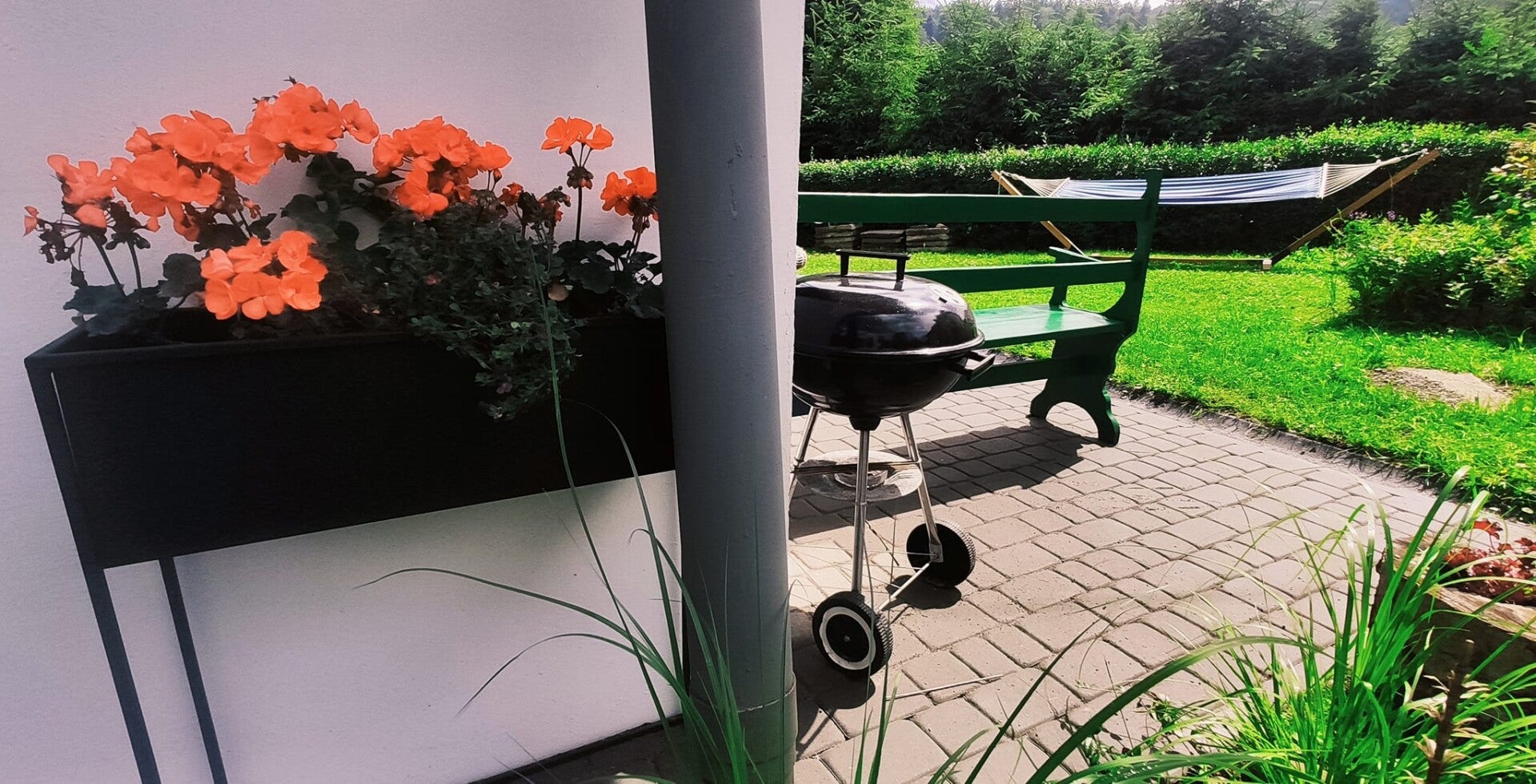 - Udogodnienia na miejscu – grill, palenisko, ogród, parking, hamak, leżaki, gry, książki,